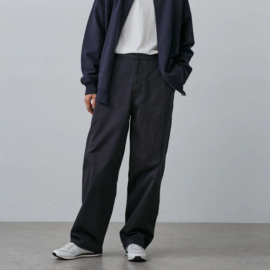 ワイドシルエットのチノパンツ。